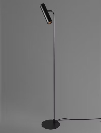 Lámpara de pie orientable 270°, luz directa direccional, cabezal de aluminio mecanizado CNC, base y pie metálico, cable alimentación 1,5m negro o blanco ON/OFF, base con bumpers de elastómero negro.